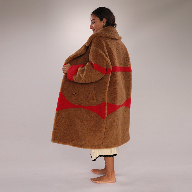 Bold meets cozy in this oversized double-breasted faux fur coat featuring a striking caramel base and flame red geometric accents—perfect for standout winter collections.