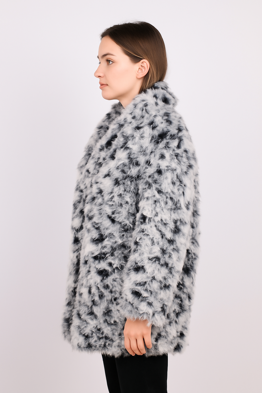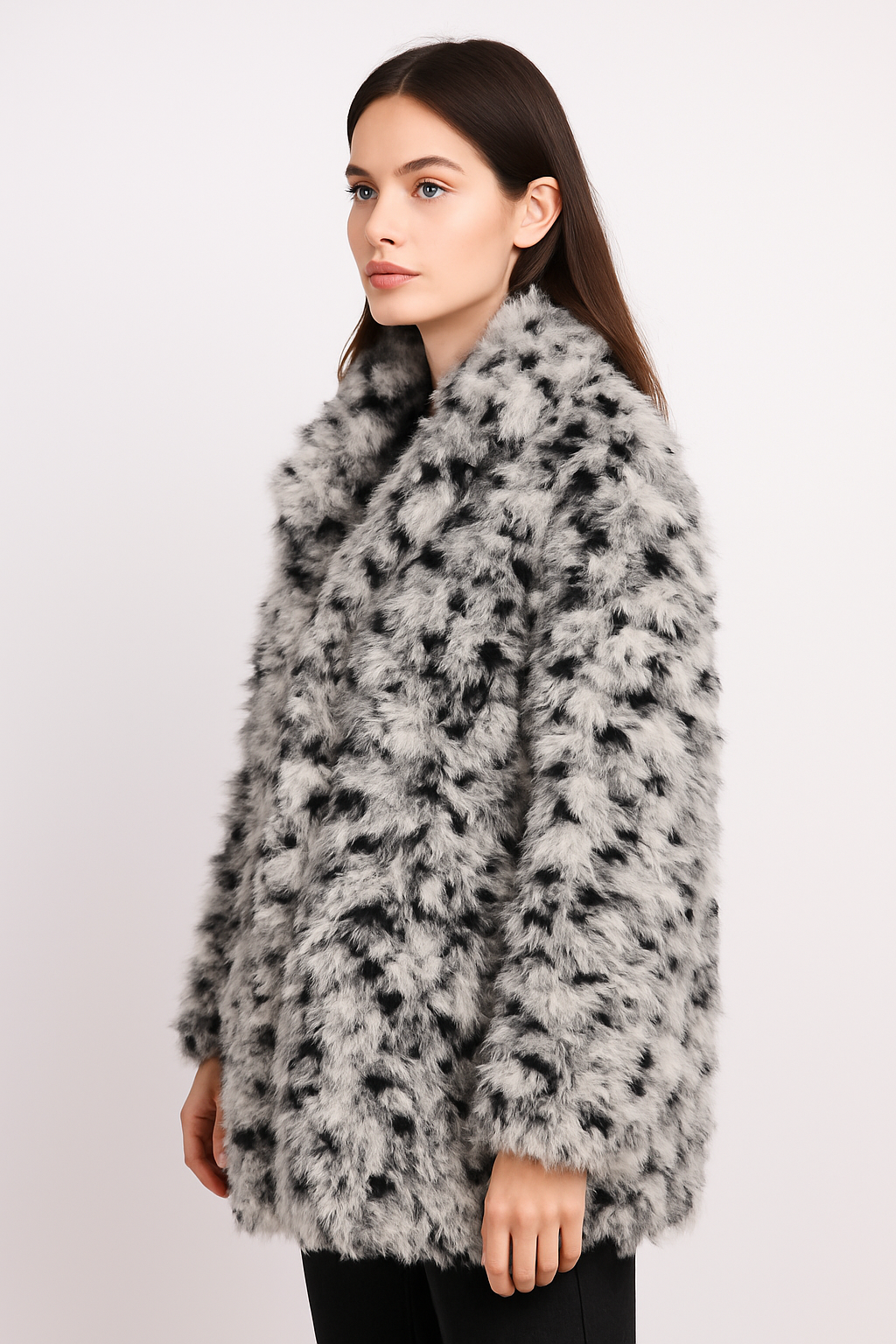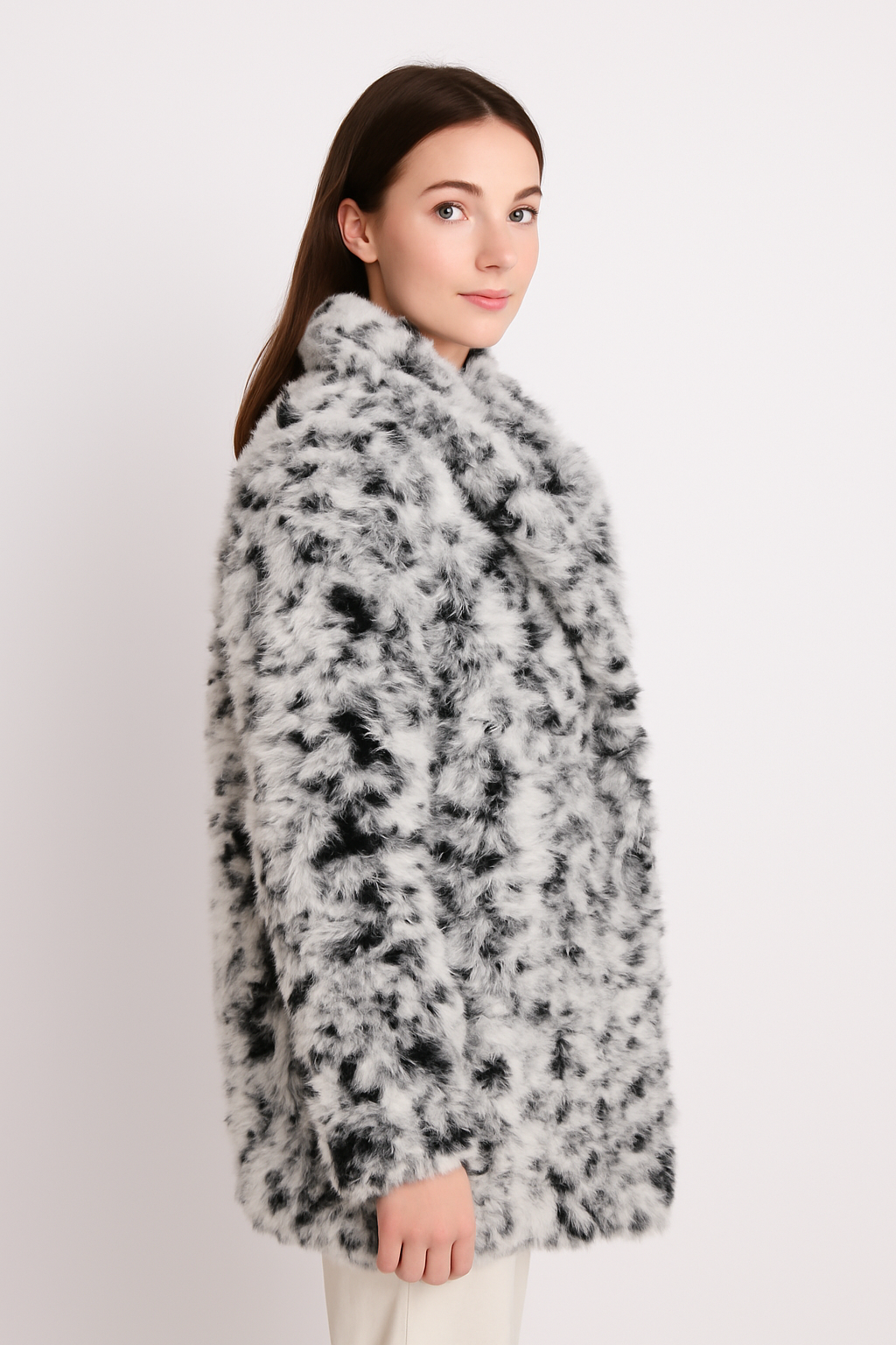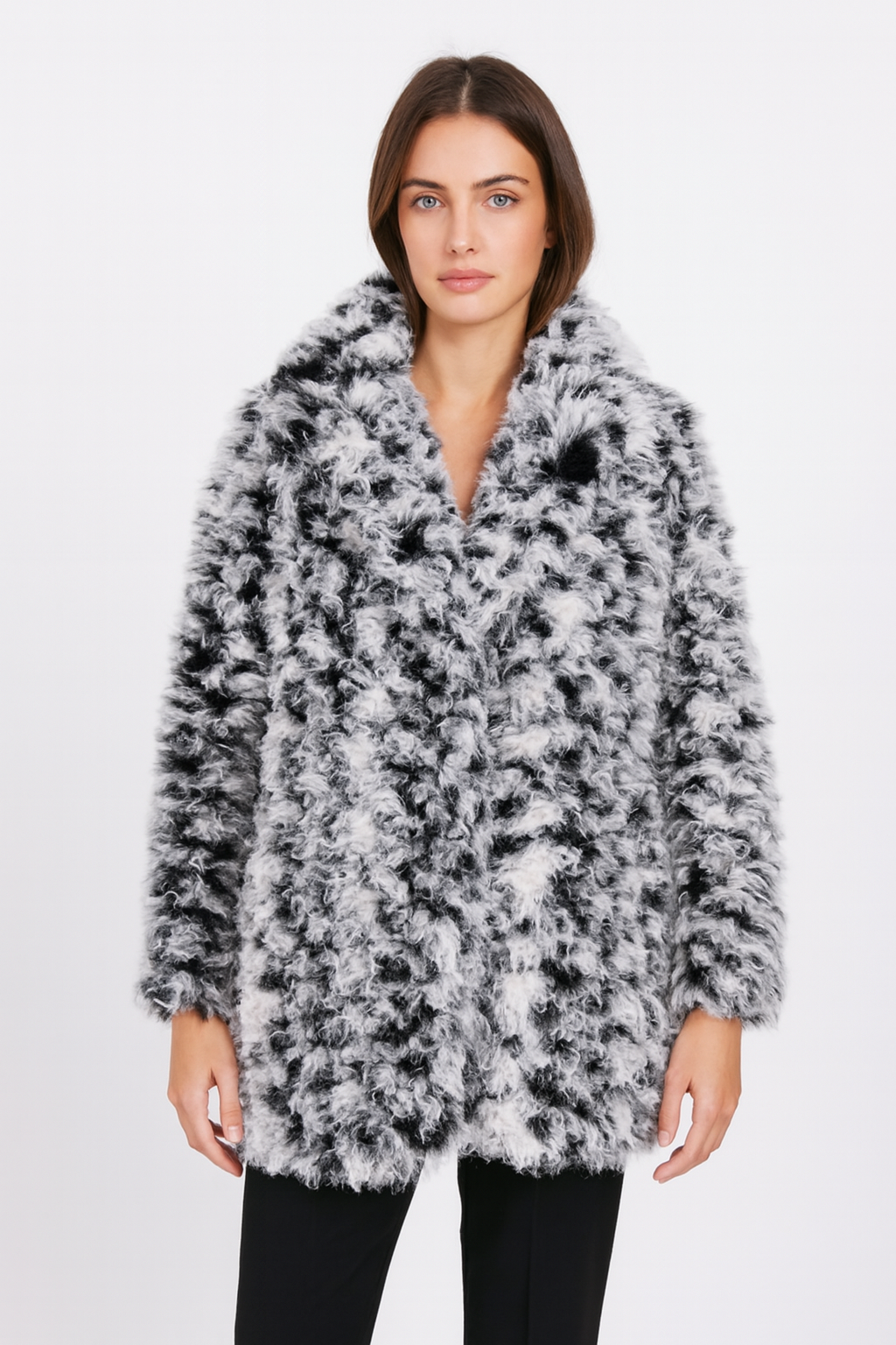 The Marbled Monochrome Eco Faux Lamb Fur Coat is designed for fashion brands, designers, and wholesale buyers who value sustainable luxury outerwear.