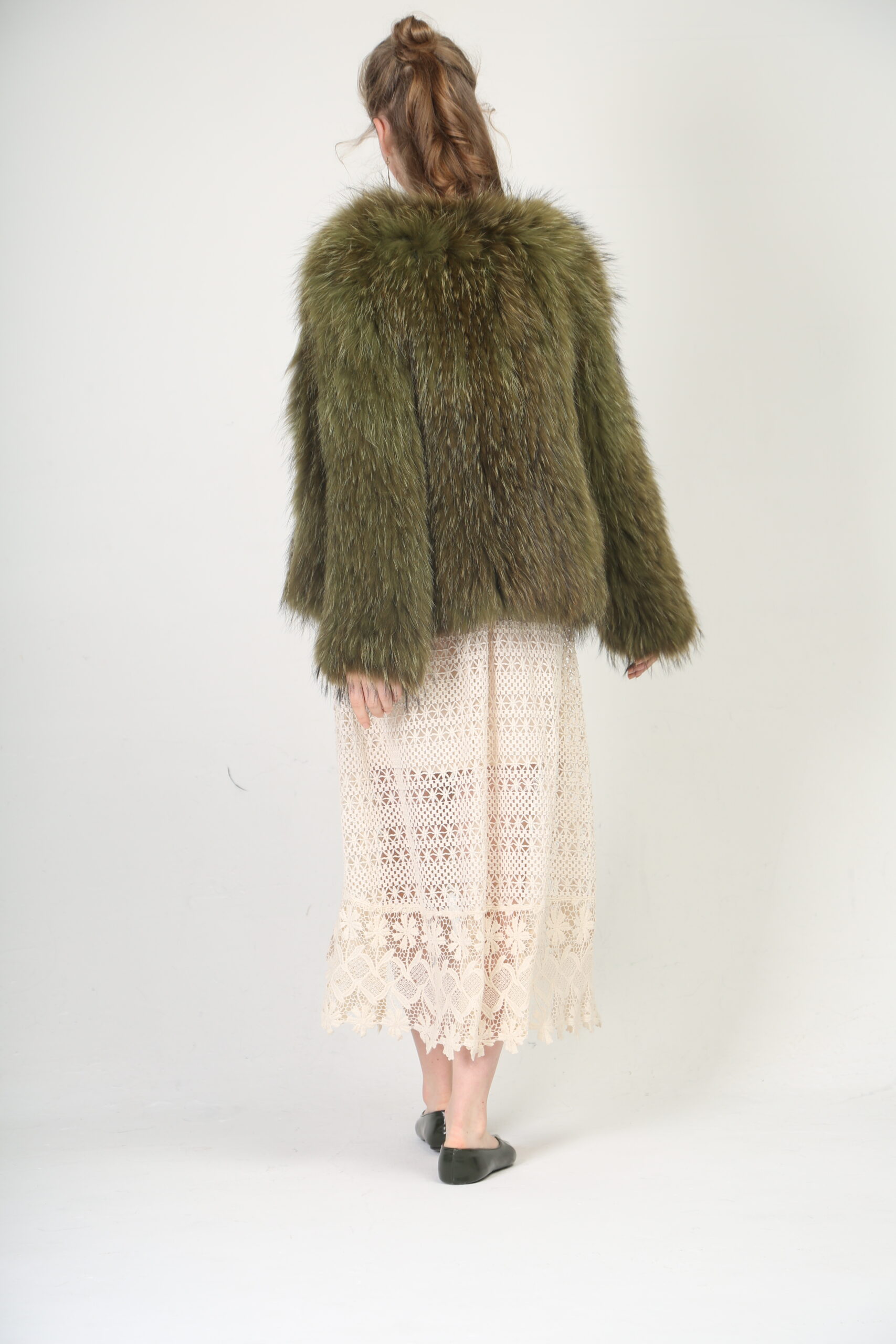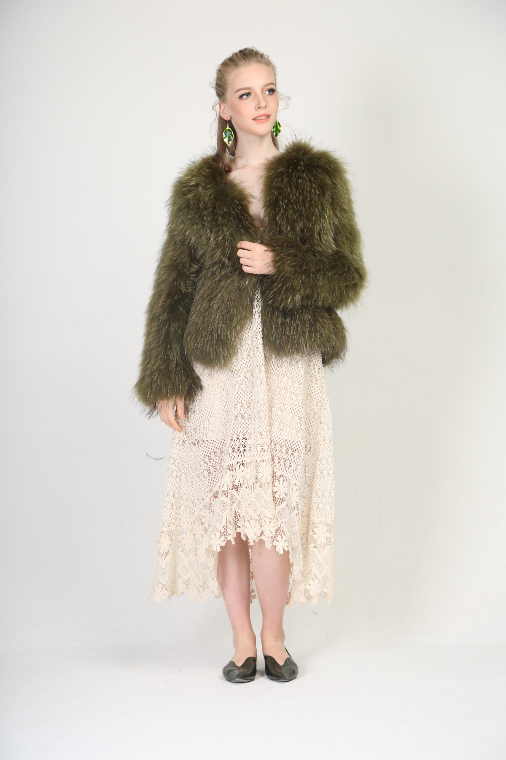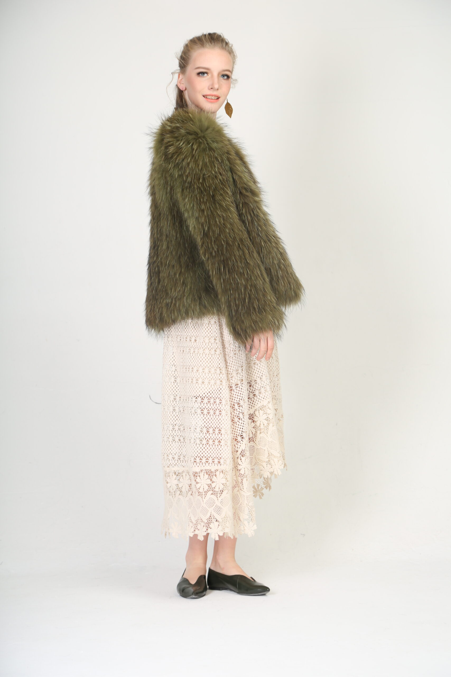 The earthy olive tone and full raccoon fur give a naturally elegant finish, perfect for brands or retailers seeking standout winterwear.
