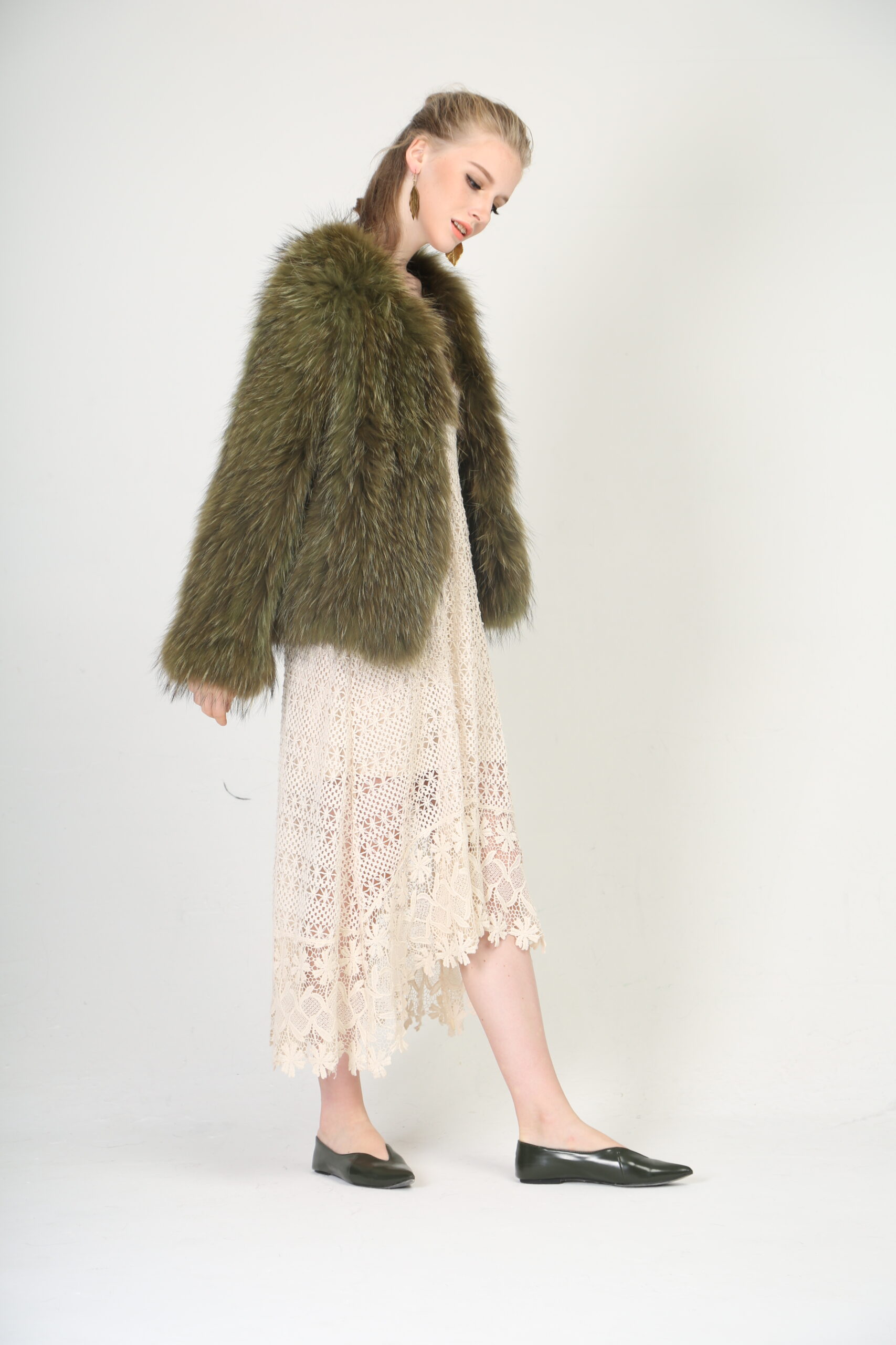 This knitted coat features 100% genuine raccoon fur with an ultra-soft hand feel, dyed in a unique olive green tone. It is fully knitted—not lined—making it stretchable, breathable, and incredibly cozy. The long sleeves and clean hem finish give it a timeless, wearable silhouette.