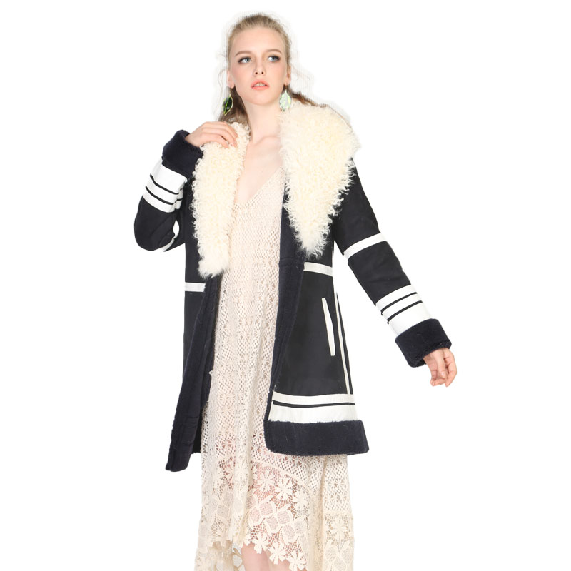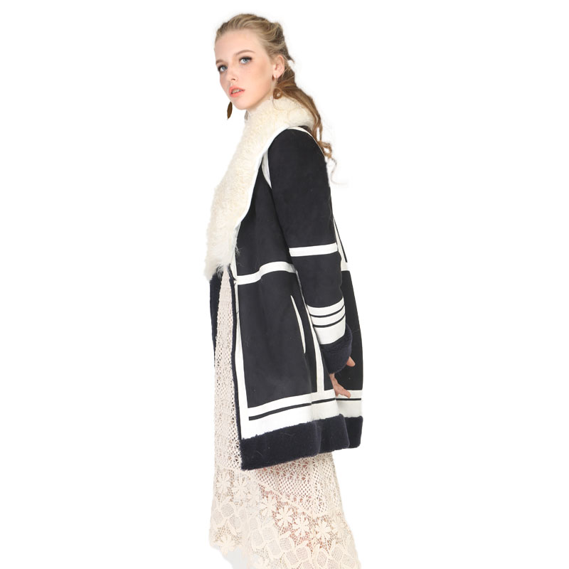 This fashion-forward coat fuses classic aviator vibes with modern elegance. Crafted from real integrated sheep wool and fur, it features a soft suede outer and a thick, cloud-like white tan wool collar. Striking white stripes and rich texture create a bold winter fashion statement.