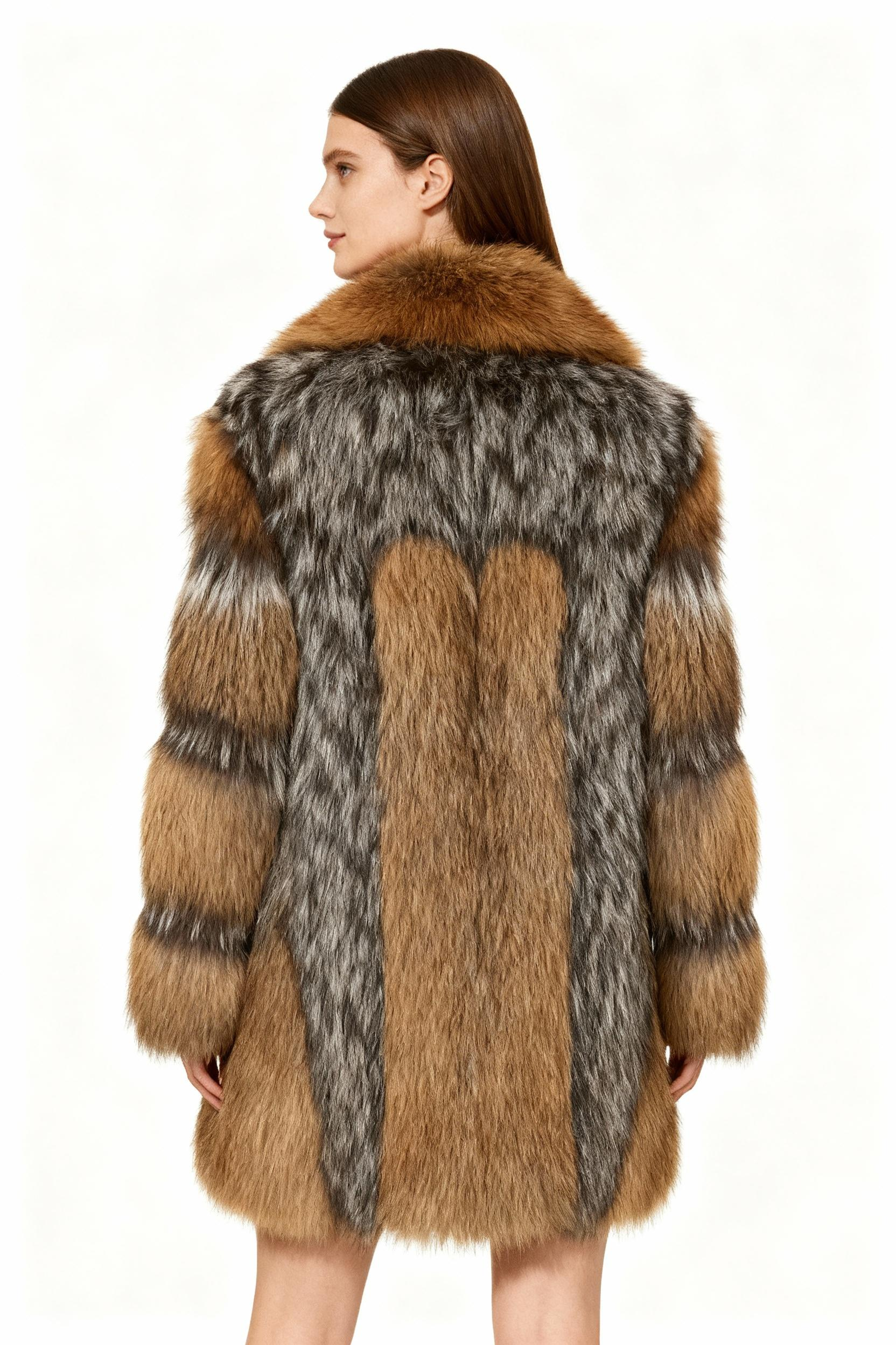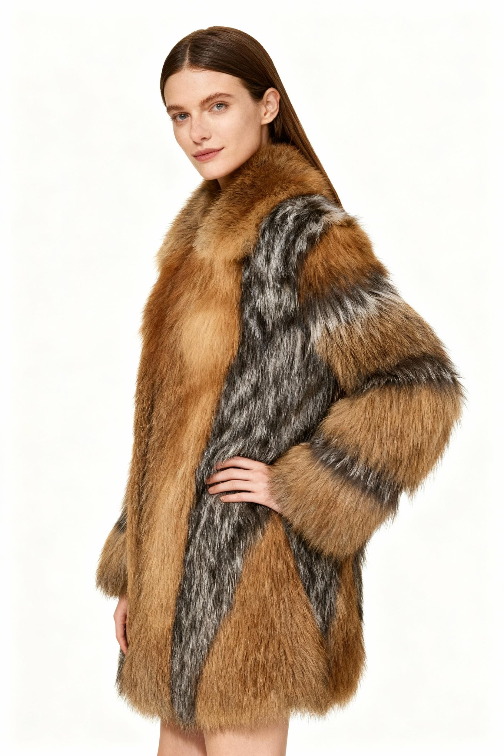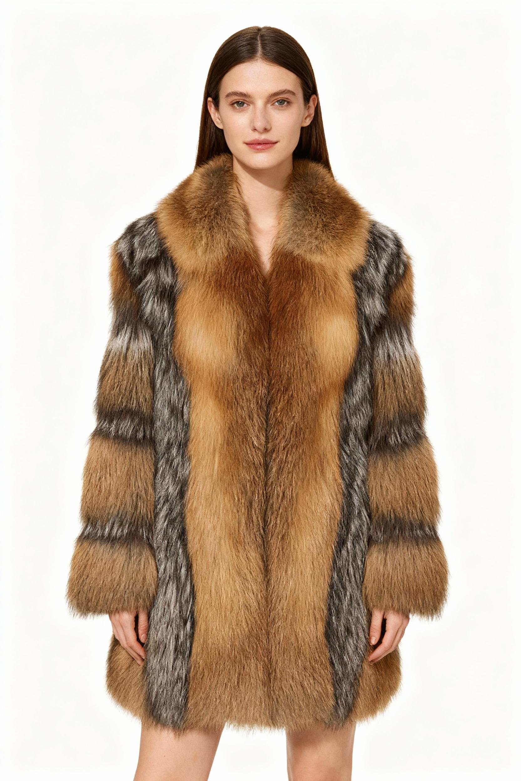 This opulent mid-length coat is handcrafted from 100% real fox fur, blending rich red-gold and silver-black pelts to create a dramatic, natural color-blocked effect. Perfect for winter collections targeting elite clientele, this coat delivers unmatched warmth, plushness, and timeless prestige.
