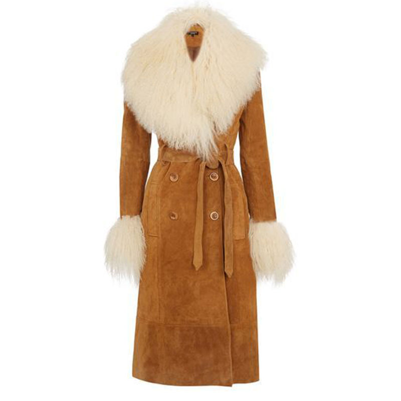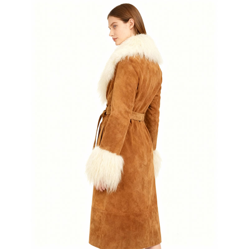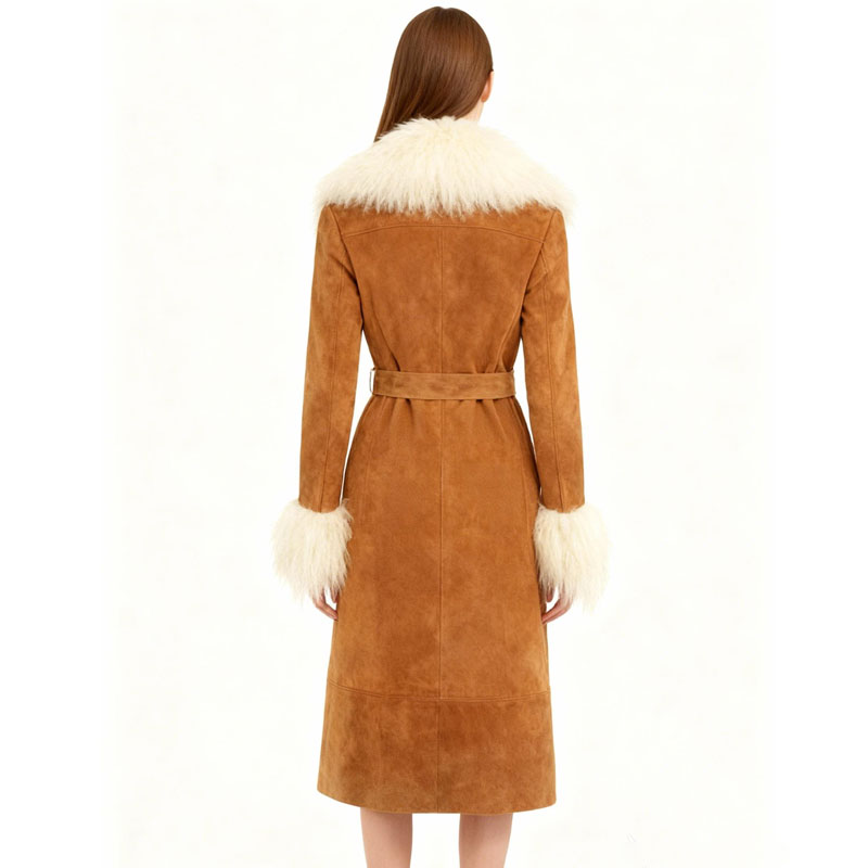 Crafted from buttery suede fabric in a warm caramel tone, this trench features an oversized real sheepskin fur collar and cuffs in contrasting ivory. The belted waist and double-breasted front create a flattering silhouette, while the natural textures lend high-end sophistication perfect for editorial and boutique curation.