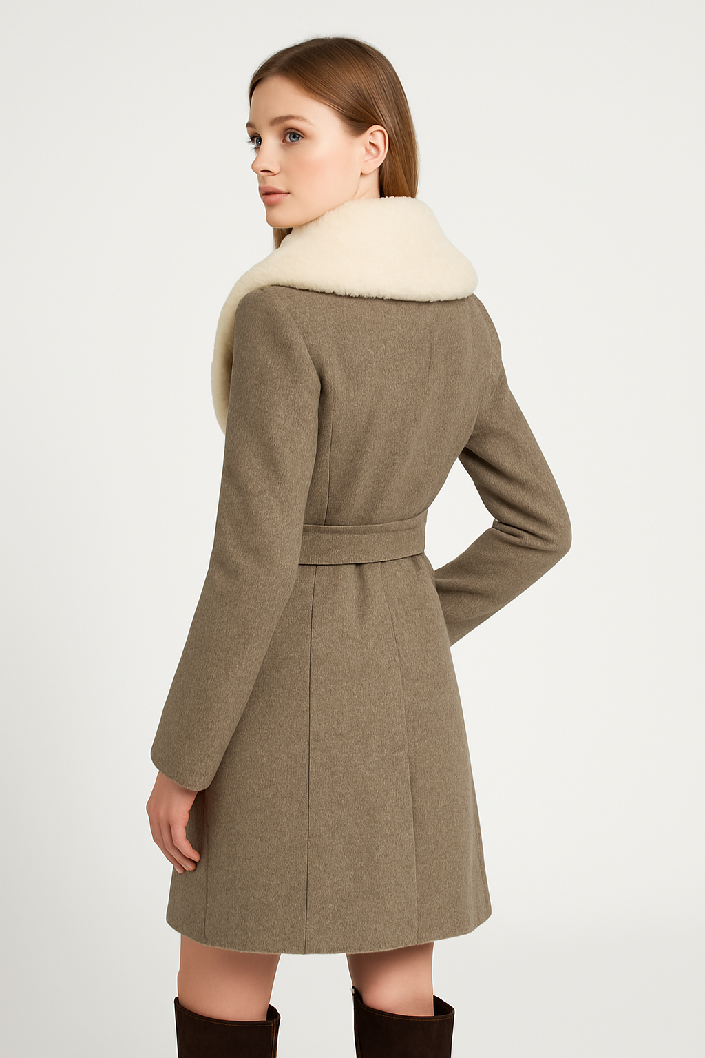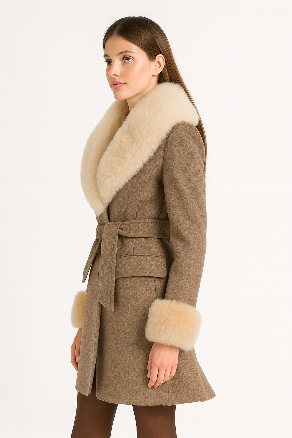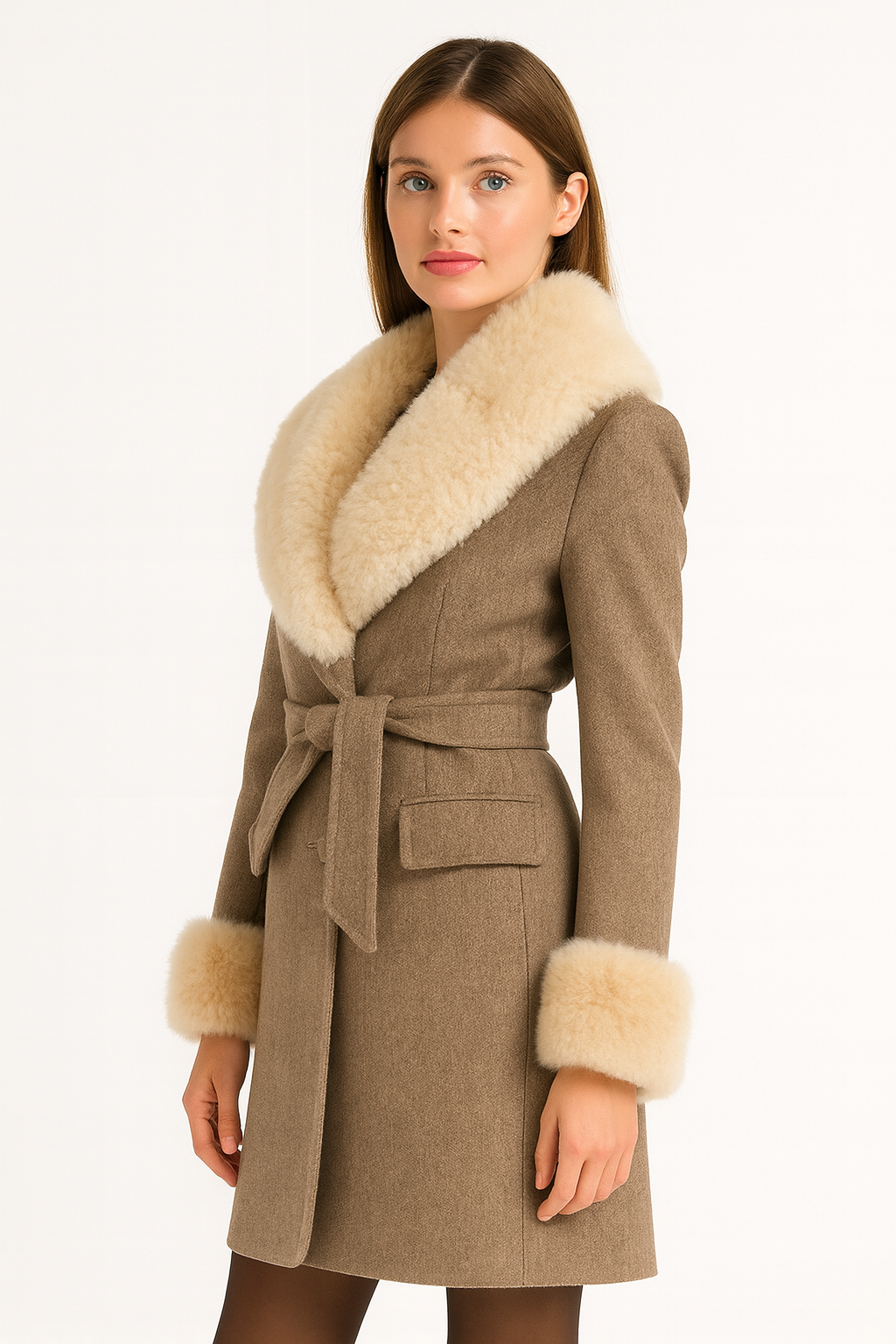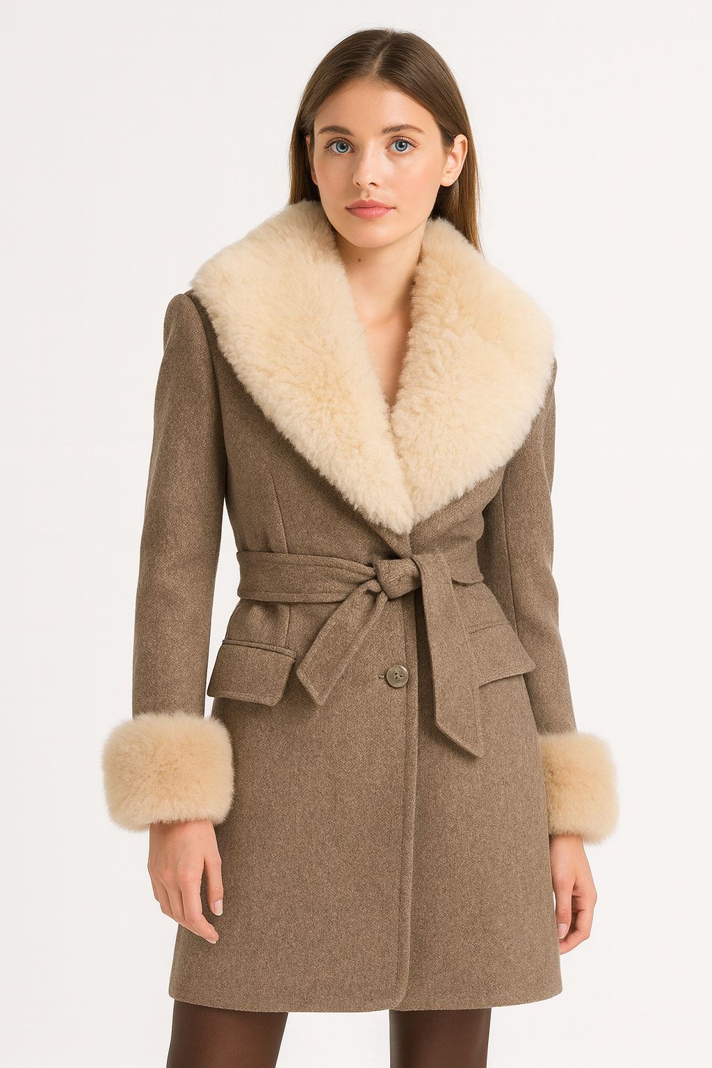 A nod to classic retro elegance, this wool coat with a plush shearling collar and cuffs offers timeless sophistication with a modern twist — perfect for those who adore heritage fashion.