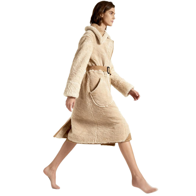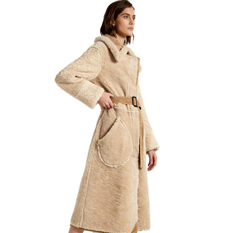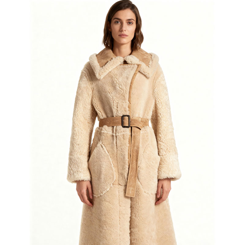 This coat features genuine double-faced sheepskin in a creamy beige tone, combining suede finish on the outside with soft shearling on the inside. A wide lapel collar, sculpted panels, and belted waistline give it structure and a flattering silhouette.