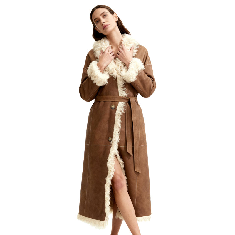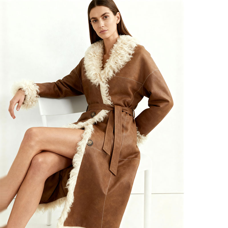 A luxurious blend of natural materials and timeless elegance, this long robe-style coat features velvety suede on the outside and soft, fluffy sheep fur on the trim. It’s a cozy yet elevated winter essential designed for refined wardrobes with a rustic edge.