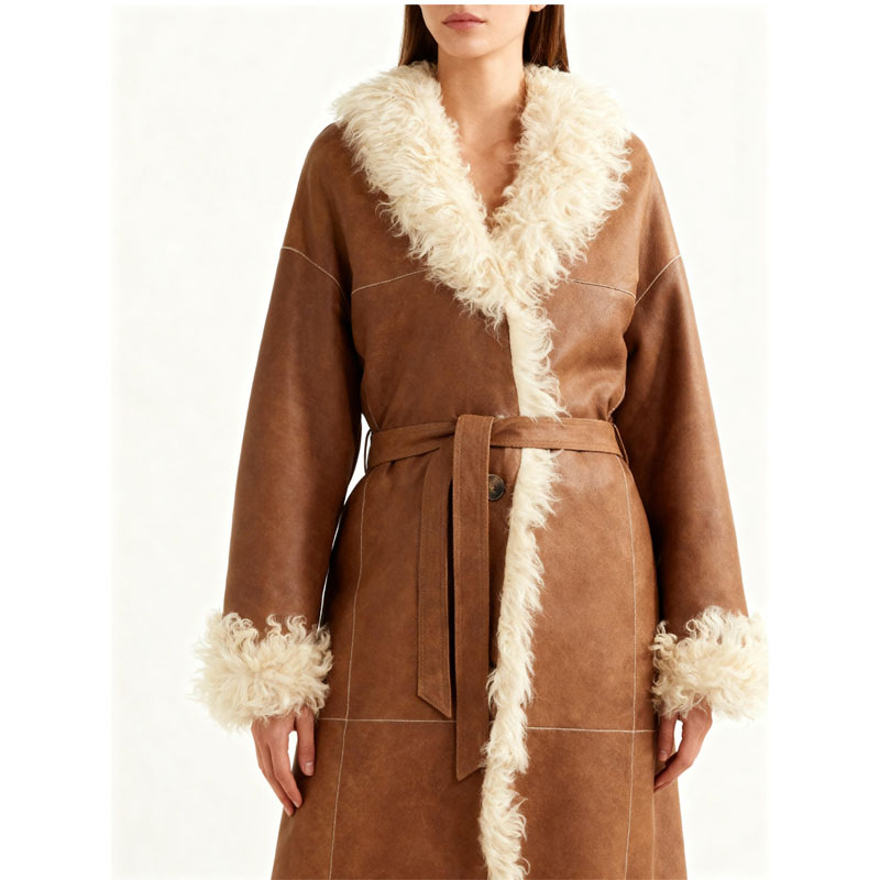 Designed for winter sophistication, this full-length women’s shearling coat brings together buttery-soft suede and authentic sheep fur in a belted wrap silhouette. The textured cream-colored fur along the collar, cuffs, and hem adds tactile contrast and warmth, making it an ideal statement piece for both indoor lounging or chic outdoor layering.