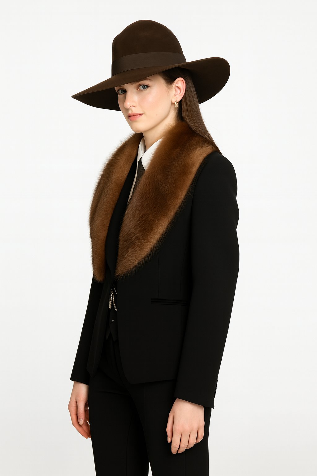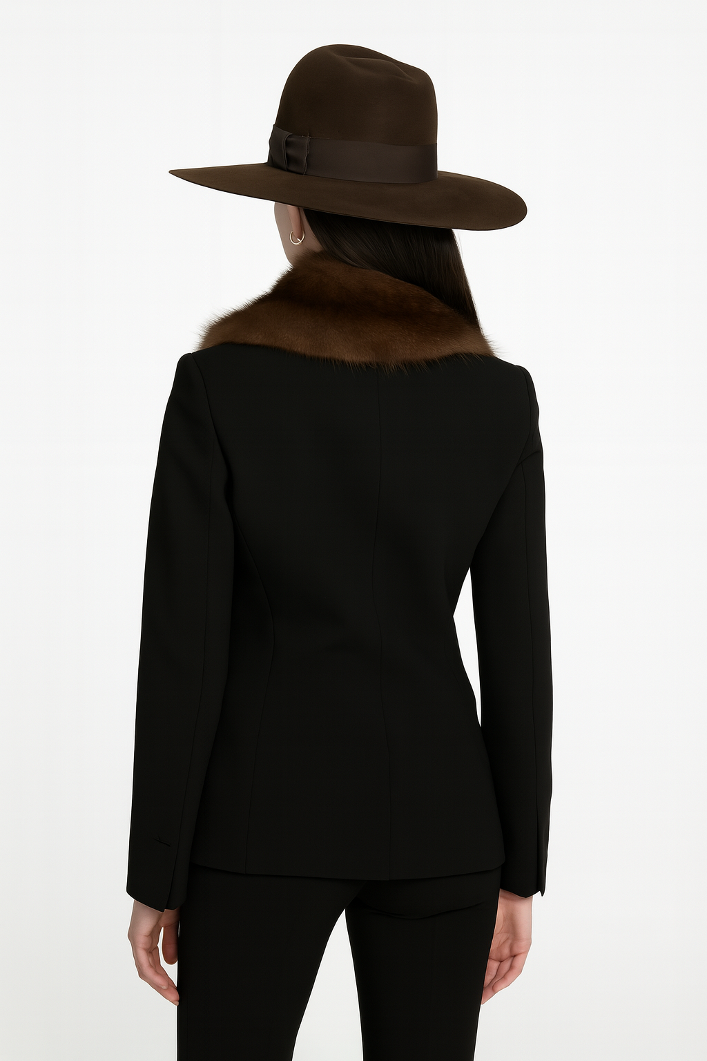 This blazer merges heritage tailoring with the softness of faux mink, offering vintage allure with modern values. It appeals to clients who crave both structure and softness — ideal for stylists, influencers, and boutique clients looking to make a chic statement.