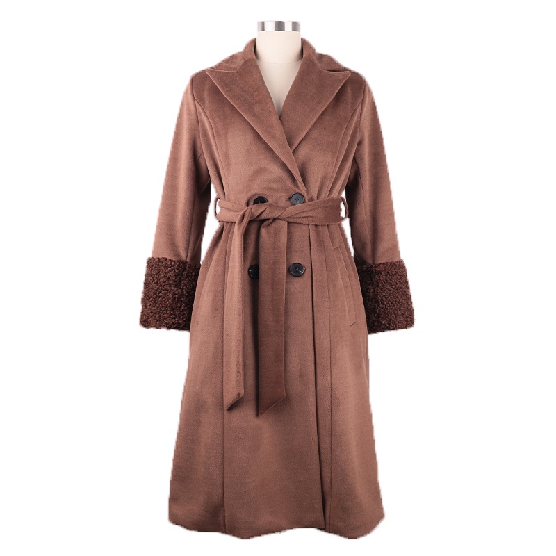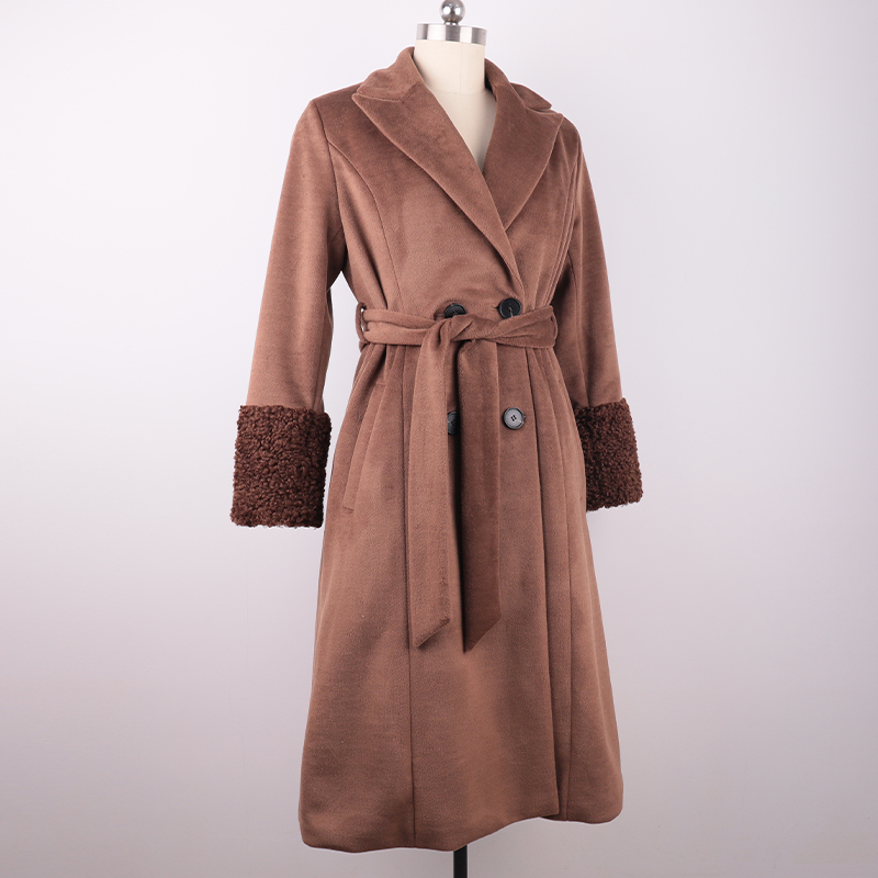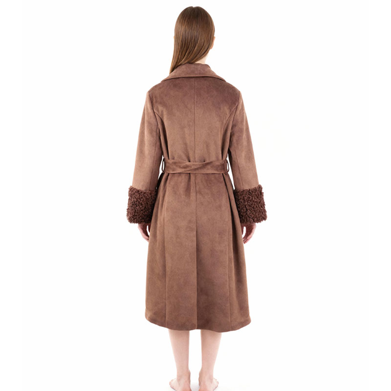 Designed for warmth and understated luxury, this mid-length coat balances classic tailoring with textural contrast. The wide lapel collar and tie waist lend a flattering, feminine shape, while the teddy-style faux fur cuffs add a touch of contemporary elegance. Ideal for brands targeting refined womenswear markets.