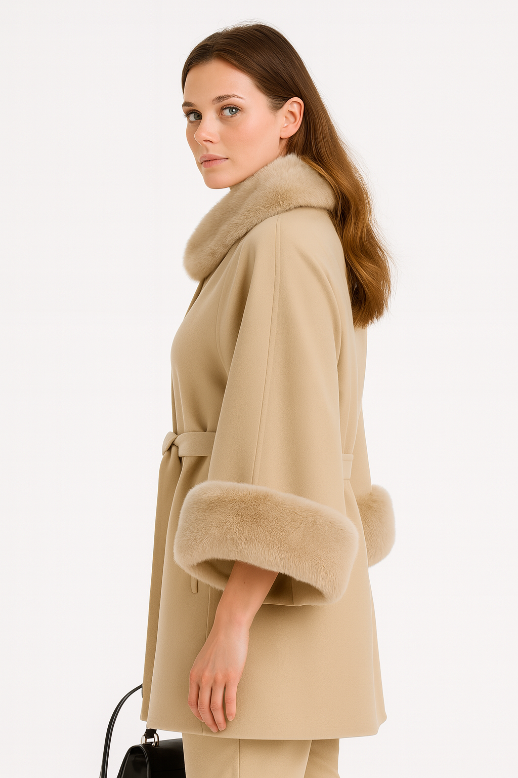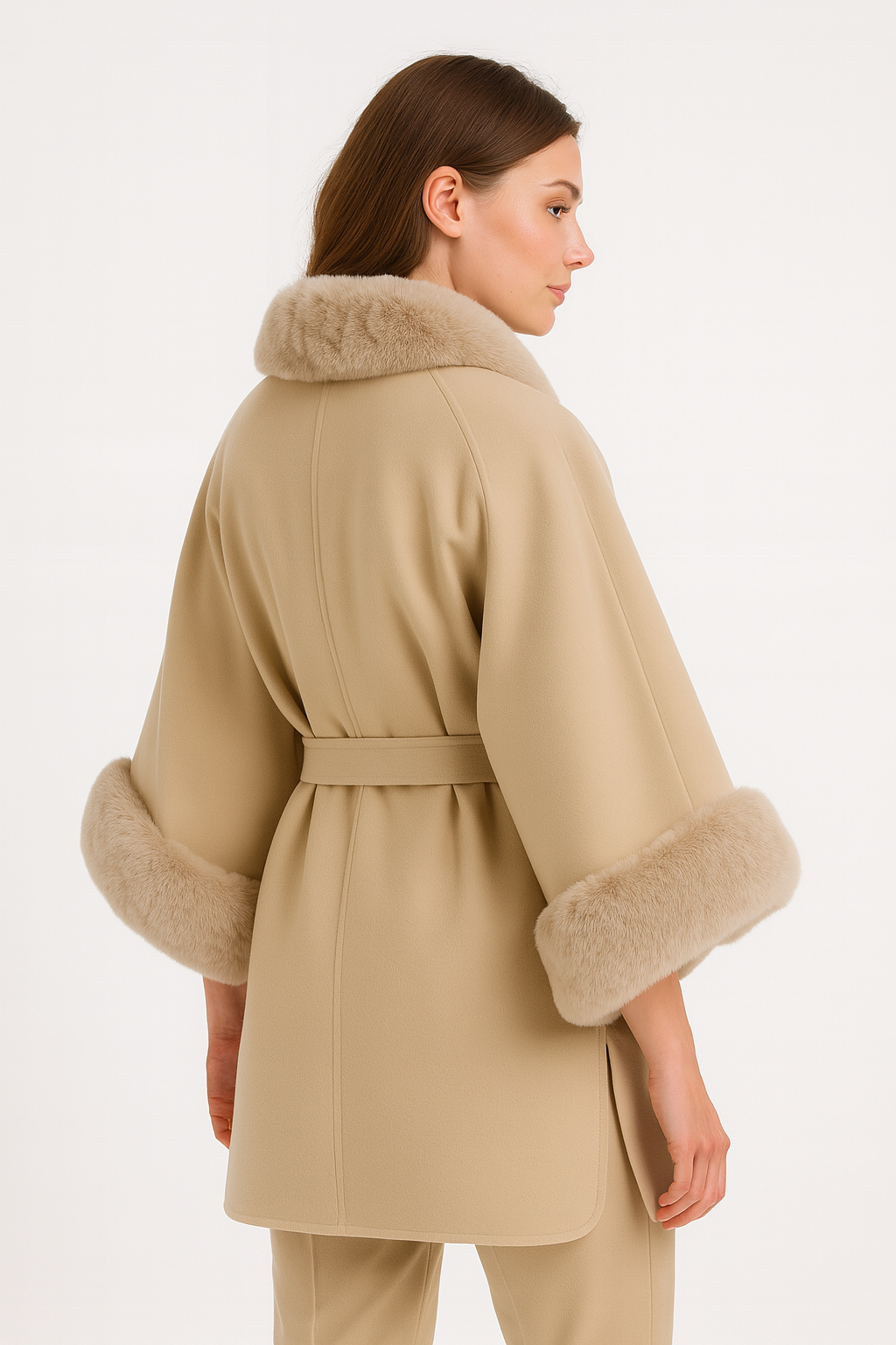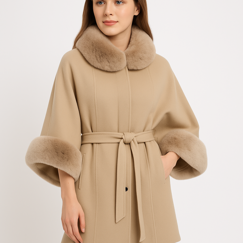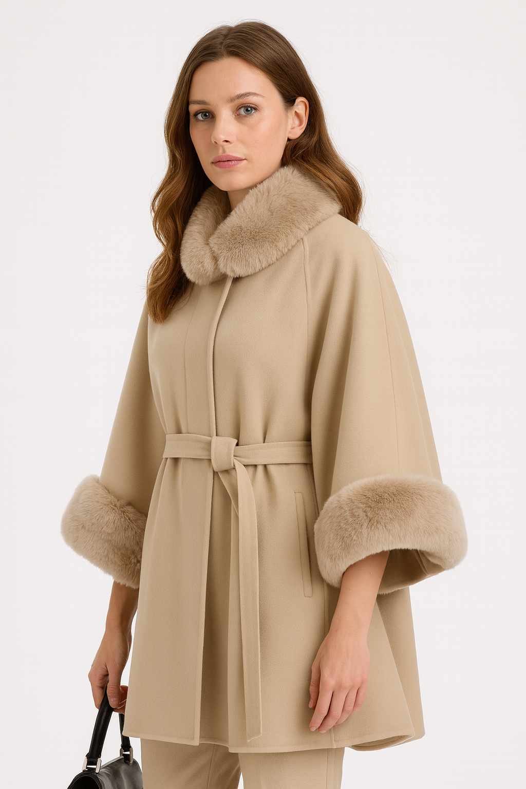 This luxurious cape-style coat blends timeless elegance with modern flair, featuring soft wool, a cinched waist, and plush fur trim for cozy sophistication.