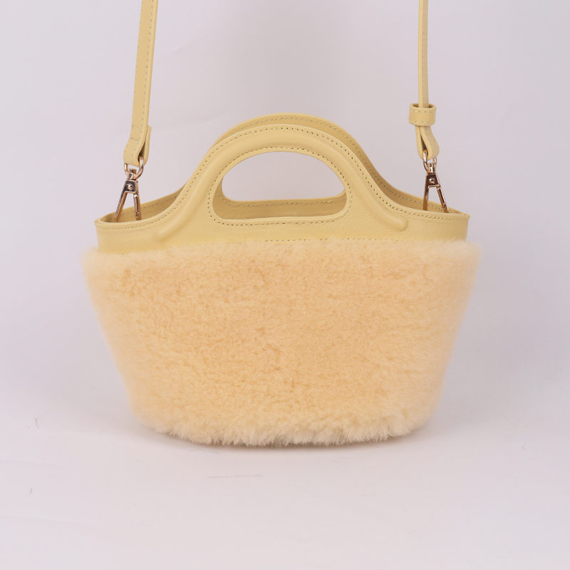 A perfect fusion of texture and structure, this mini tote bag features plush wool and smooth leather in a charming rounded silhouette. Designed for fashion-forward minimalists who love tactile detail and playful winter hues.
