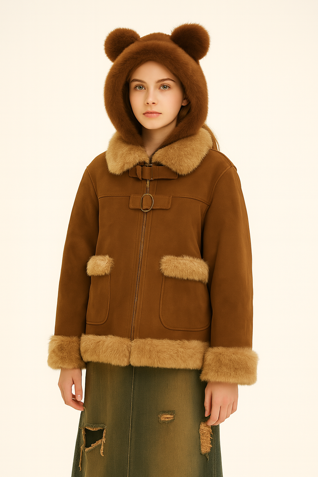 The Y2K Bear Ear Faux Suede Fur Jacket combines Harajuku charm with Y2K street nostalgia, offering warmth, personality, and standout texture.